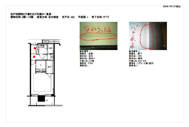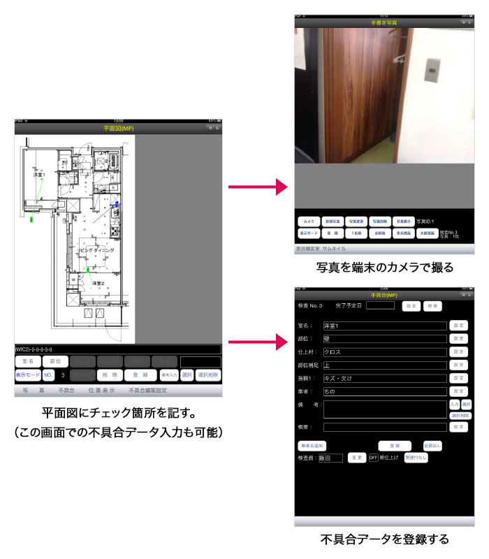 端末の表示図面に専用ペンで紙に書くようにチェック。内容をリストボックスの中から選択し登録。